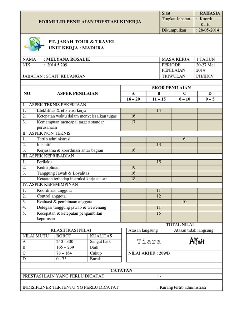 Menurut handoko (1999) terdapat 10 (sepuluh) manfaat yang dapat dipetik dari penilaian prestasi kerja yang baik, sebagai berikut Contoh surat penilaian prestasi kerja guru berikut ini adalah contoh surat penilaian prestasi kerja guru yang bisa anda download secara gratis di website kami. Penilaian prestasi kerja (performance appraisal') adalah suatu proses mengevaluasi atau menilai prestasi kerja karyawan. Sekolah kebangsaan kampong kolam 26800 kuala rompin pahang darul makmur. Untuk itu diterbitkanlah peraturan pemerintah peraturan pemerintah republik indonesia nomor 46 tahun 2011 tentang penilaian prestasi kerja pegawai negeri sipil. Penjaga keamanan menempati urutan 1, sekretaris menempati urutan 2 dan manajer menempati urutan 3. Contoh borang penilaian prestasi kerja bagi sesuatu organisasi atau syarikat. Definisi rating scale sendiri merupakan salah satu alat untuk memperoleh data yang berupa suatu daftar yang. Zulkarnain,sh.mh 1222222 penata muda iii/b dosen pss dpk di kopertis wilayah xi drs.h.muntaha 1959. Citra anugrah lifany 15110021 dosen: Contoh form standar penilaian kinerja karyawan. Formulir penilaian prestasi kerja pegawai negeri sipil. Penilaian prestasi kerja pns yang terdiri atas unsur sasaran kerja pegawai (skp) dan perilaku kerja.
