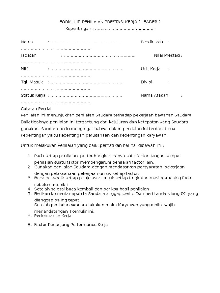 Contoh Formulir Penilaian Prestasi Kerja Bralink Id from i1.wp.com Di bagian ini juga admin atau. Pada penilaian absensi, anda bisa gunakan seperti contoh pada gambar atau bisa dirubah nilai nilainya sesuai kebijakan. Education for management of human resources video di atas dibuat dalam rangka pemenuhan tugas ujian akhir semester pada mata kuliah manajemen sumber daya. Untuk itu diterbitkanlah peraturan pemerintah peraturan pemerintah republik indonesia nomor 46 tahun 2011 tentang penilaian prestasi kerja pegawai negeri sipil. Penilaian prestasi kerja (performance appraisal') adalah suatu proses mengevaluasi atau menilai prestasi kerja karyawan. Penilaian prestasi ialah penilaian yang sistematik mengenai prestasi kerja para pekerja. Penilaian prestasi kerja pns terdiri atas : Berdasarkan hasil observasi, mekanisme pelaksanaan dan pengarsipan angka kredit, dan contoh dokumen sebagai.