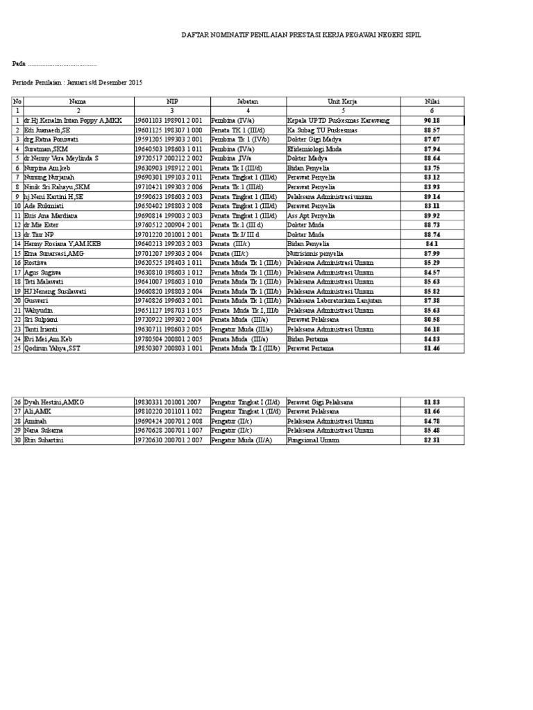 Jangka waktu penilaian bulan januari s/d desember 2014. Pada penilaian absensi, anda bisa gunakan seperti contoh pada gambar atau bisa dirubah nilai nilainya sesuai kebijakan. Aspek yang berpengaruh pada penetapan saat penilaian adalah Metode penilaian prestasi kerja a. Penilaian prestasi kerja dilaksanakan oleh pejabat penilai sekali dalam 1 (satu) tahun.